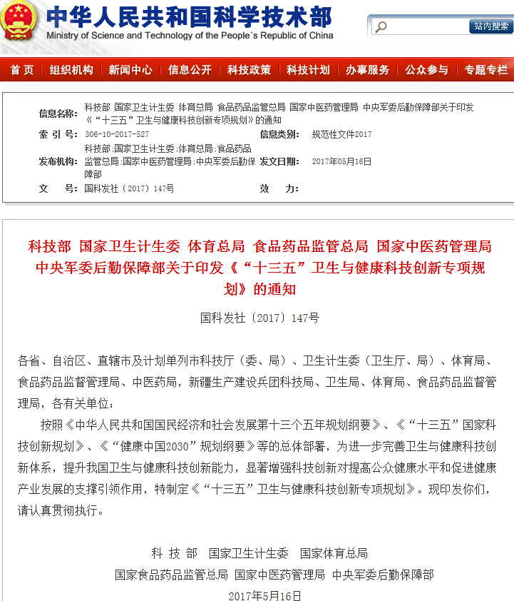 六部委聯(lián)合發(fā)布《“十三五”衛(wèi)生與健康科技創(chuàng)新專(zhuān)項(xiàng)規(guī)劃》