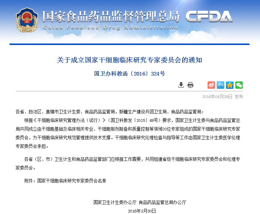 各省、自治區(qū)、直轄市衛(wèi)生計生委、食品藥品監(jiān)管局,新疆生產(chǎn)建設(shè)兵團衛(wèi)生局、食品藥品監(jiān)管局: 根據(jù)《干細胞臨床研究管理辦法(試行)》(國衛(wèi)科教發(fā)〔2015〕48號)要求,國家衛(wèi)生計生委與食品藥品監(jiān)管總局共同成立由干細胞基礎(chǔ)及臨床相關(guān)專業(yè)、干細胞制劑…