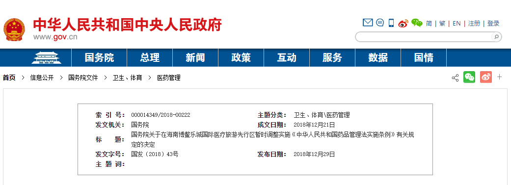 近日,國務(wù)院發(fā)布《關(guān)于在海南博鰲樂城國際醫(yī)療旅游先行區(qū)暫時調(diào)整實(shí)施<中華人民共和國藥品管理法實(shí)施條例>有關(guān)規(guī)定的決定》。國務(wù)院決定,在海南博鰲樂城國際醫(yī)療旅游先行區(qū)暫時調(diào)整實(shí)施《中華人民共和國藥品管理法實(shí)施條例》第三十六條的規(guī)定,對先行…