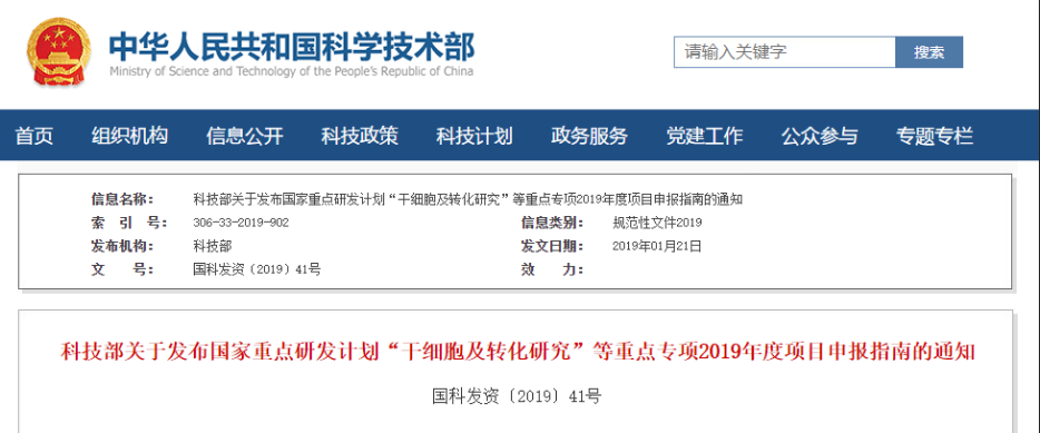 2019年1月21日,我國科技部官網(wǎng)正式發(fā)布了“干細(xì)胞及轉(zhuǎn)化研究”重點(diǎn)專項(xiàng)2019年度項(xiàng)目申報指南,指南中明確:在之前已支持98個項(xiàng)目的基礎(chǔ)上,2019年國家再撥款4億元,支持12個干細(xì)胞研究方向。其中干細(xì)胞資源庫、干細(xì)胞治療性腺衰老也寫入申報指南。指南中明確…